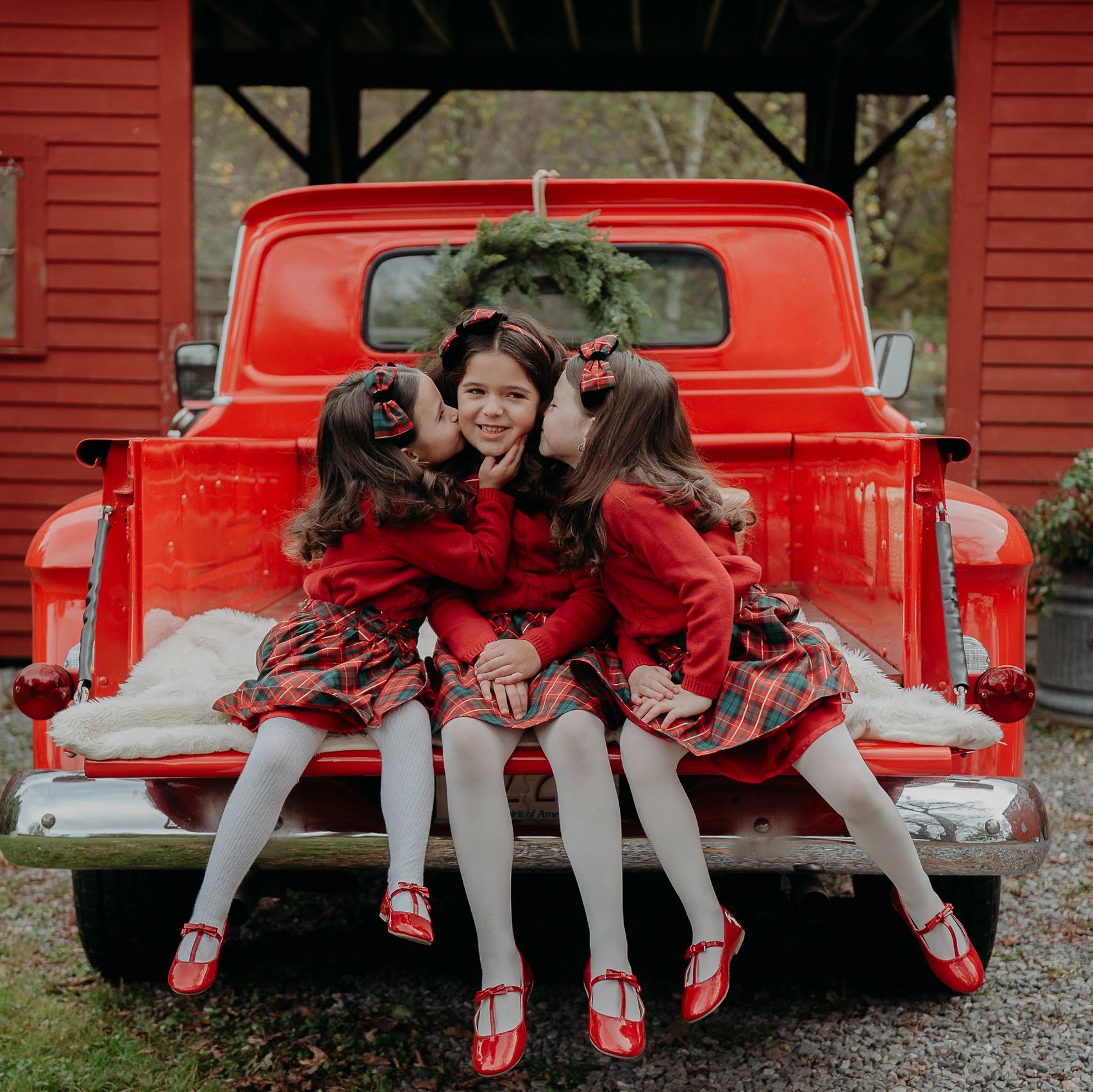 This  years holiday set features a tall, twinkling evergreen tree, a vintage  stone mantel adorned with an elegant wreath and brass candlesticks, and a  rich leather sofa styled with cozy textures. I’ll also be adding in a  curated selection of holiday blankets, ornaments, and presents when  needed for added color and variety. The result is a refined, timeless  backdrop designed for portraits that feel both modern and classic—images  you’ll cherish and proudly display for years to come.